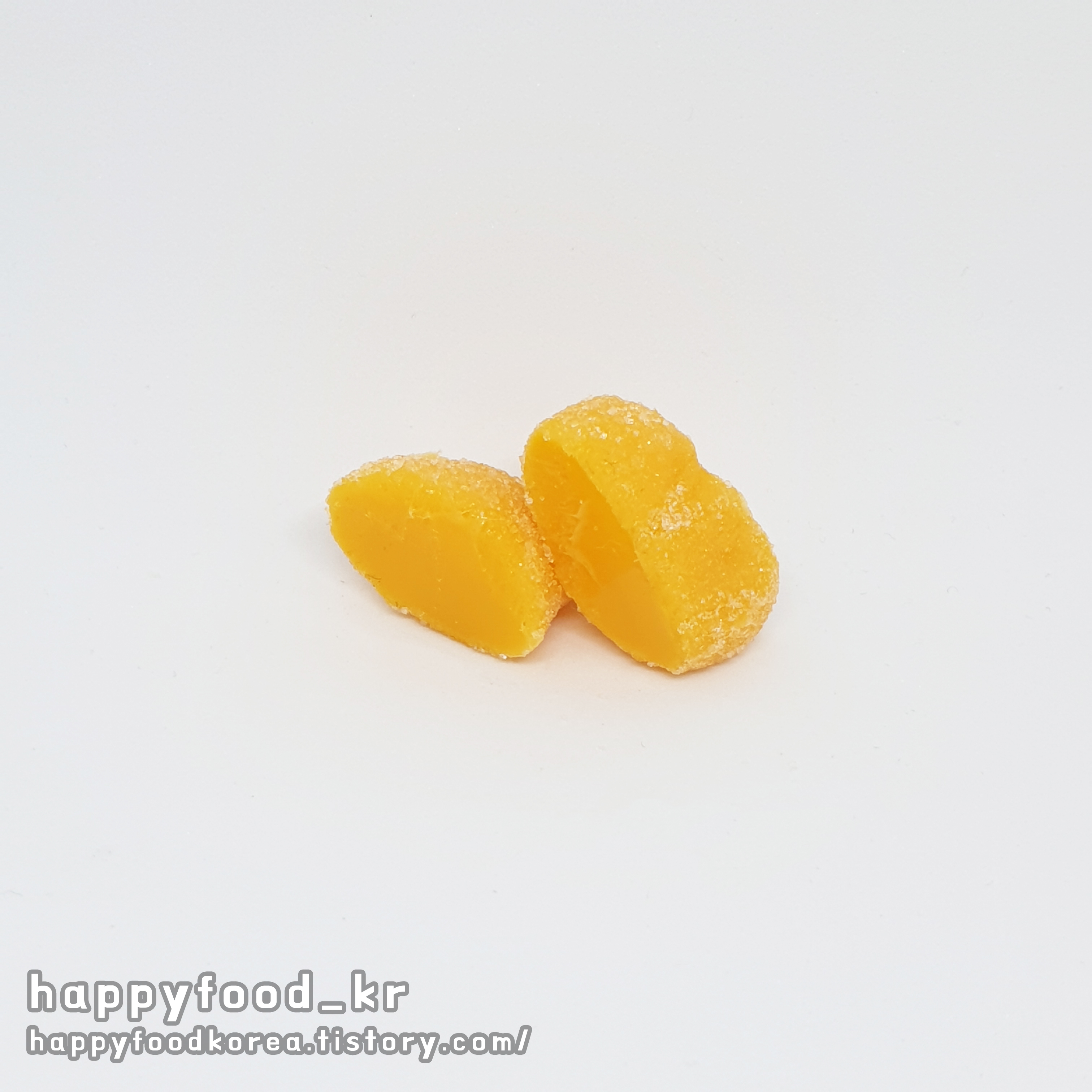 When I open the package, it smells like mango skin! The bright yellow mango jelly with mango shape and the sugar that shines on the outside. It looks like mango flesh with white sugar falls down.